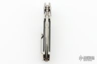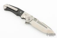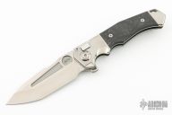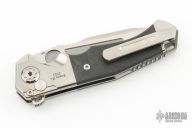 This ADV Ronin button lock flipper has a satin finished tanto blade with notched flipper and thumbrest. Handle has a satin finished titanium frame with marble carbon fiber inlays, titanium pivot collars, tip up titanium clip. Nice smooth action, detent, lockup and blade seating. Comes with original case. Excellent condition.
