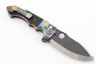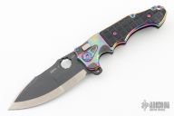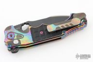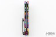 The Mini Alpha is the smaller second button lock model from ADV, although judging from the name, it is quite possible that Andre came up with this design before the Pitboss. Regardless, we must say that he absolutely nailed both the aesthetics and ergonomics in each and every way. Pushing in the rectangular button releases the blade, dropping it freely closed as fast as it flies open, and the inlay is just icing on the cake. The pocket clip and ergonomic handle shape allow you to easily grip the knife with your fingers clear from the path of the blade so you're never in any danger. It makes handling the Mini Alpha an absolute treat and the ergonomics are fantastic for small to medium-sized hands. It features a partial titanium backspacer with an integral lanyard hole, right-hand titanium pocket clip, and the inset pivot that put Andre on the map for us. This is another excellent ADV knife and, in our opinion, one of the best designs he has ever delivered.