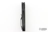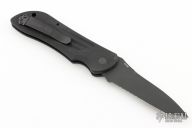 This 9100SBK by Benchmade features a black coated tanto blade with false top edge, partial serrations and a notched thumbrest. The handle is black aluminum with a black tip up stainless steel clip. Has some scuffs, otherwise good condition.