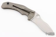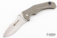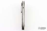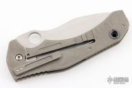 This knife features a satin finished recurve blade with a thumbhole and a notched thumbrest. The handle has a bead blasted titanium frame with a tip up pocket clip. Has some light scratches otherwise the knife is in excellent condition.