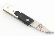This is a rare collectable Police Issue small auto with satin blade of just 1 7/8" that may be legal in California.The handle features plastic bolsters with pearlex scales over steel liners.  Plastic backspacer. Strong opening action with trigger lever. Comes with original box. Light scratches are visible on the blade and handle otherwise the knife is in excellent condition.