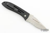 This Military Auto by Smith & Wesson is from the First Production Run. It features a satin finished partially serrated blade with notched thumbrest. The handle has a black aluminum frame with tip up black stainless steel clip, lanyard hole. Comes with original box. Has scuffs and scratches and patina. Great condition otherwise.