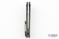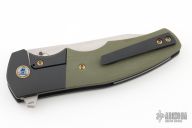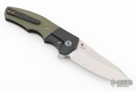 This Crossroads flipper by Reate is a Kirby Lambert design, it features a satin finished blade with a notched flipper. The handle has a black tumbled titanium frame, green G-10 scales, anodized titanium hardware and pivot collars, blasted titanium tip up clip and floating backspacer. Rides on bearings, nice detent, lockup and blade seating. Comes with original zippered case. Excellent condition.