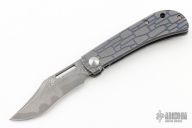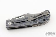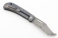 This Rebel Framelock from Jim Burke has a recurved Chad Nichols San Mai Damascus clip point blade with swedge and thumb hole. The handle is comprised of a milled and anodized titanium frame with notched satin titanium backspacer, lanyard hole and a titanium tip up clip. Lanyard hole in pommel. Includes a zippered case. Originally from the 2017 Blade Show in Atlanta. Excellent condition.