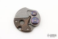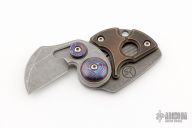 This Custom Coin Claw Gen 3 by Serge Panchenko features a stonewashed chisel ground wharncliffe blade with a timascus thumbstud and pivot collar. The handle is stonewashed titanium with a copper overlay. Has a detent to hold the blade in position open/closed, but it does not lock. Excellent condition.