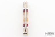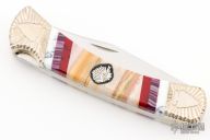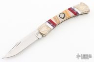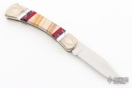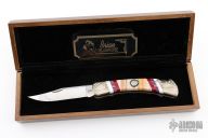 This Custom Buck Model 110 has been customized by Brian Yellowhorse. It features a mirror polished blade with nail nick. The blade says 004/100. The handle features a nickel silver frame with carved bolsters, with multi-piece scales including mammoth ivory. Includes a presentation box and COA. Excellent condition.