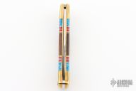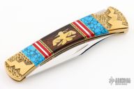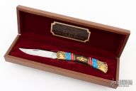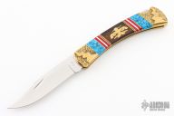 This Buck Model 110 has been customized by Brian Yellowhorse. It features a mirror polish finished clip point blade with a single nail nick. The handle features froward and rear brass bolsters with multi piece scales. Includes a wooden display case. Excellent condition.