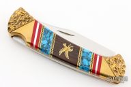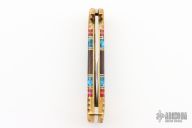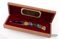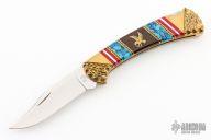 This Buck Model 112 has been customized by Brian Yellowhorse. It features a mirror polish finished clip point blade with a single nail nick. The handle features froward and rear brass bolsters with multi piece scales. Includes a wooden display case. Excellent condition.