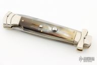 This lockback Auto by AGA Campolin has a stainless steel spear point blade with false top edge. Handle is honey horn with nickel silver bolsters, brass liners, stainless steel backspacer. Has some light scratches, otherwise excellent condition. Dated 2014