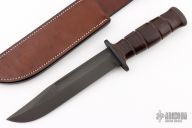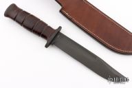 This MK1 Fighter by Claude Bouchonville features a black blade with false top edge and fullers, .226" blade stock and 1.313" blade depth, hidden tang construction. The handle has black steel guard, stacked leather grip with black canvas micarta spacer. Comes with a brown leather sheath. Excellent condition.