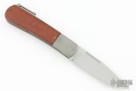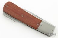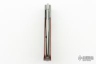 This Front Flipper by Stephane Espi features a bead blast finished drop point blade with notched front flipper tab and fullers. The handle has a bead blasted titanium frame, with titanium bolsters, micarta scales, and tip up backspacer/integrated clip. Nice detent, lockup and blade seating. Can be flicked open from the closed position with the fuller underneath. Comes with zipper case. Has some scuffs and scratches, great condition otherwise.