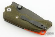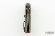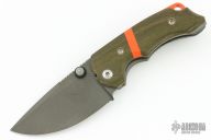 This Dervish Comanche features a darkened bead blast finished drop point blade with dual thumbstuds and a notched thumb rest. The handle features cross cut green canvas micarta scales with an orange g10 stripe, bead blast finished liners and an orange g10 backspacer with lanyard hole. Blade is centered when closed, locks up with no play, and has a nice crisp detent. This piece comes in a padded case with Dervish patch and COA. Has a couple scuffs on the clip, excellent condition otherwise.