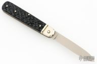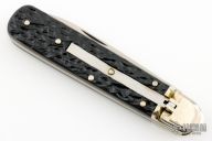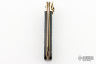 This Boker Leverlock features a drop point blade. The handle is comprised of nickel silver bolsters and jigged black scales over brass liners and stainless steel backspring. Has a little patina, otherwise excellent condition.
