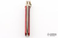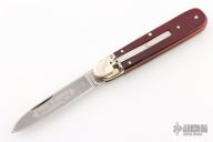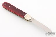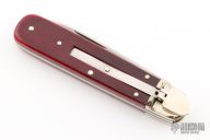 This Boker Leverlock features a drop point blade. The handle is comprised of nickel silver bolsters and red bone scales over brass liners and stainless steel backspring. Has some light scratches, otherwise excellent condition.