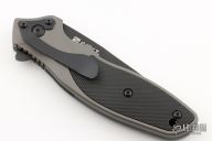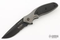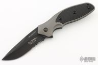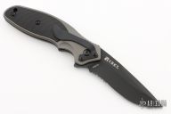 This Ken Onion Design flipper by Columbia River Knife and Tool features a black partially serrated blade with flipper. The handle has a bead blasted aluminum frame with black rubber inlays, stainless steel tip down clip. Nice detent, lockup, action and blade seating. Excellent condition. Comes with original box and papers.