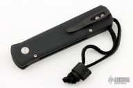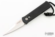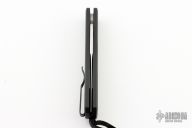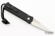 This Godson from Pro-Tech Knives features a hand ground and mirror finished blade ground by Mike Irie. The handle has a black aluminum frame with a GSD leather inlay, black stainless steel tip up clip. Comes with original box and papers. Excellent condition.