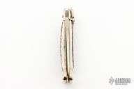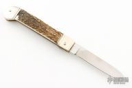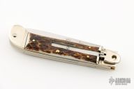 This Lever Lock Automatic by Hubertus Knives features a polished drop point blade. The handle is comprised of nickel silver double bolster and lever with stag scales over brass liners and steel backspacer. Has some light scratches, otherwise excellent condition.