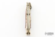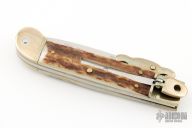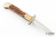 The Guardian by Hubertus Knives features a satin finish blade, nickel silver guard, bolsters, release, and pins, stag scales, and brass liners. Smooth, quick opening. Strong lockup. Scuffs and scratches are visible on the blade and handle, has some patina. Great condition otherwise.