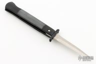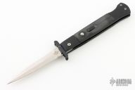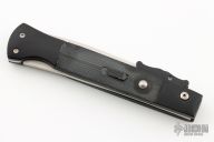 This Phantom Italian swing guard automatic by Dynamic Knife Designs has a satin finish blade and black aluminum handle with black G10 inlays. Features a ramped side positioned stainless steel safety just below the firing button. False top edge. Button release/single action with closure via the rear positioned lockbar release. Dual leaf and coil spring action providing an extremely fast opening. When closed, the dual guard rests on the frame, encompassing the blade tang. Upon opening, the guard swings into a locked position. Excellent Condition.