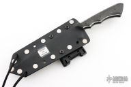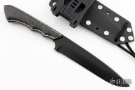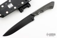 This knife by Master Smith Murray Carter features a black cerakoted hand forged blade made from Hitachi Blue Steel core laminated between 410 stainless steel, polished spine and tang. This steel affords the keenest possible edge. The handle has carbon fiber scales with white G-10 and unilateral carbon fiber liners and black pins. .160" thickness with a 1.199" blade depth, full tapered tang construction. Comes with kydex sheath with TekLok. Excellent condition.