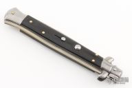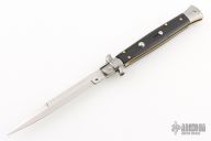 This 11" Swivel Bolster by Frank Beltrame features a tumbled bayonet ground blade with false top edge. The handle has stainless steel bolsters, front and rear, buffalo horn scales, mirror polished brass liners and stainless steel spring. Excellent condition.
