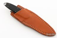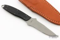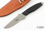 This Timberline Model SC features a bead blasted blade with sharpened and serrated top edge, .130" blade stock, .870" blade depth, full tang construction. The handl ehas black linen micarta scales. Comes with a brown leather boot sheath. Excellent condition. #072