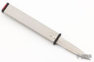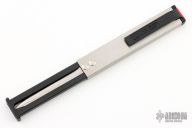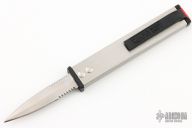 Unusual automatic where the blade is fixed and the release button retracts the guard. Satin finished partially serrated blade. Comes with original box and papers. Excellent condition.