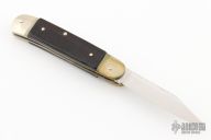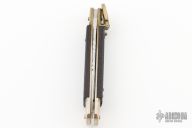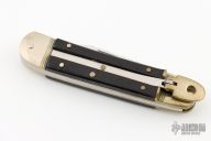This leverlock auto by Hubertus features a mirror polished blade with filework on the blade spine, nickel silver double bolsters, ebony scales, nickel silver liners and pins. Opens with a nice snap. Very fast opening.