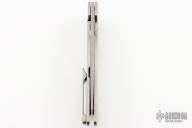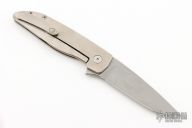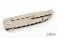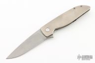 This Rask by John Grimsmo of Grimsmo Knives features a stonewashed blade with notched flipper. The handle has a "Streamline" milled titanium frame with matching tip up clip that has hidden screws, titanium barrel spacers and screws. Numbered #942 on the spine of the blade. Includes original box and COA dated March 3, 2022. Excellent condition. This knife was original anodized, the anodization has been removed.