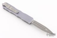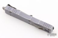 This Dirac OTF automatic by Microtech features a D/E apocalyptic finished blade with a standard edges. The handle is distressed gray aluminum with stainless steel tip down clip. Serial number 12860 and dated 12/2022. Comes with original box and papers. Has some stains on the blade, otherwise good condition.