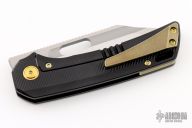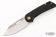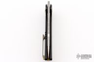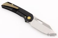 This Relative Framelock Front Flipper by EMP EDC features a satin finished clip point blade with notched thumbrest, front flipper, and a thumbhole. The handle has a black milled titanium frame, anodized titanium backspacer, hardware and Zircuti tip up clip. Rides on bearings, nice detent, lockup and blade seating. Excellent condition. Comes with original box, papers and zippered case.