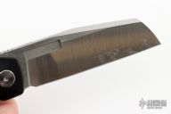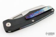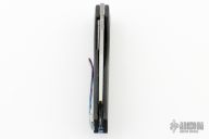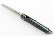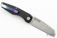 This Axon Third Run Folder by Vero Engineering features a satin finished blade with notched thumbrest and thumbhole. The handle has carbon fiber scales with inlaid liner, titanium tip up clip with hidden screws, titanium backspacer. Rides on bearings, nice detent, lockup and blade seating. Comes with zippered case and COA #488. Has some scratches on the blade, otherwise good condition.