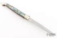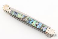 This Sicilian Ring Pull Stiletto from AGA Campolin features a tumbled bayonet ground blade. The handle has a nickel silver bolsters and ring-pull with abalone scales over brass liners and stainless steel backspacer. Includes a black leather slip sheath and COA.  Excellent Condition.
