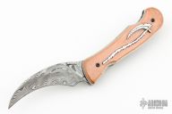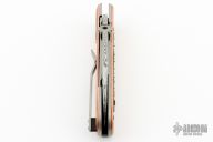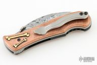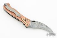 This Elvia Folder by Korth Cutlery features a Damasteel hawkbill blade with bead blast finish thumbdisc. The handle has copper scales with silver details, orange peel finished titanium liners and a tip up titanium clip with G10 backspacer. Comes with Velcro case, COA and Patch. Rides on IKBS, nice detent, lockup and blade seating. New from maker!