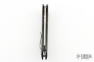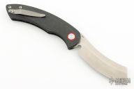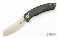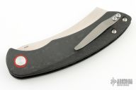 The Red Horse Knife Works Hell Razor P features a satin finished blade with a notched thumbrest. The handle has carbon fiber scales with red G-10 pivot collars, inlaid stainless steel liners, tip up bead blasted titanium clip. Comes with original box. Excellent condition.