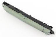 This Troodon OTF automatic features a double-edged black blade with a standard edges. The handle has a black aluminum frame with Jade Green G-10 composite top, with all black hardware and stainless steel clip. Glass breaker. Includes original box and papers. S/N #448 and dated 09/2022. Excellent Condition.