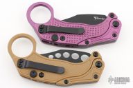 Reat Knives is making yet another splash with the EXO-K Gravity Karambit Knife. That's right: it's both a Karambit and a Gravity Knife. By holding down the button and flicking your wrist, the blade and frame will rock back and forward again, deploying the wickedly-curved blade into the open position where it locks. Push the button again and reverse the steps to close the knife. Thanks to its reversible pocket clip, you can carry it to your preference. And speaking of preferences, finger rings aren't for everyone. In the case of EXO-K, it's removable! Like any good trick, operating this attention-grabbing knife will take some practice—which can be done safely with the included blue trainer—but once you have it down, you'll be flipping this bad boy into action. It's great for day-to-day cutting, fidgeting, and self-defense situations. The Reate EXO-K takes pocket knife fun to a new level with an innovative, practical, and entertaining design. It's built to Reate's exacting quality standard with tough and affordable materials, like aluminum and Bohler N690 steel, to keep the cost down. The EXO-K is truly a knife like no other.