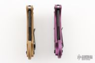 - Handle: Purple-anodized aluminum handle scales with frag-texture milling and a titanium backspacer.