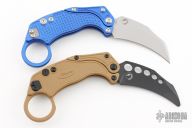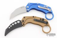 Reat Knives is making yet another splash with the EXO-K Gravity Karambit Knife. That's right: it's both a Karambit and a Gravity Knife. By holding down the button and flicking your wrist, the blade and frame will rock back and forward again, deploying the wickedly-curved blade into the open position where it locks. Push the button again and reverse the steps to close the knife. Thanks to its reversible pocket clip, you can carry it to your preference. And speaking of preferences, finger rings aren't for everyone. In the case of EXO-K, it's removable! Like any good trick, operating this attention-grabbing knife will take some practice—which can be done safely with the included blue trainer—but once you have it down, you'll be flipping this bad boy into action. It's great for day-to-day cutting, fidgeting, and self-defense situations. The Reate EXO-K takes pocket knife fun to a new level with an innovative, practical, and entertaining design. It's built to Reate's exacting quality standard with tough and affordable materials, like aluminum and Bohler N690 steel, to keep the cost down. The EXO-K is truly a knife like no other.