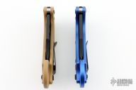 - Handle: Blue-anodized aluminum handle scales with frag-texture milling and a titanium backspacer.