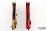 - Handle: Red-anodized aluminum handle scales with frag-texture milling and a titanium backspacer.
