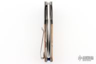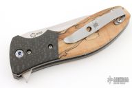 This Lambert Snap Flipper has a satin finished recurve blade. Handle has carbon fiber bolsters, spalted maple scales, bead blasted titanium liners, titanium barrel spacers, and a stainless steel tip up clip. Comes with nylon zippered case. Nice detent, lock up and blade seating.  Excellent condition.