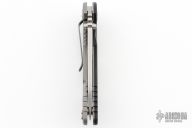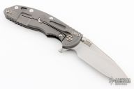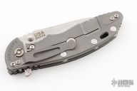 This XM-18 by Rick Hinderer features a stonewash finished blade with notched thumbrest and flipper. The handle has a working finished titanium frame with black G-10 scale, and a tip up or down reversible titanium clip, pivot, and filler tab, lanyard hole at the butt. Comes with original box and extra hardware. New condition.