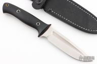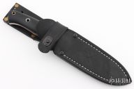 This knife by Vehement Knives features a satin finished spear point blade with a false top edge and fullers, full tang construction, .189" Blade Stock, 1.274" Blade Depth. The handle features double black canvas micarta scales and hollow pins and red liners. Includes a black leather sheath with white stitching. Includes original box and papers. Dated May 19th, 2023. New Condition.