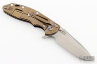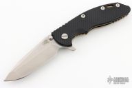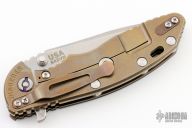 This XM-18 by Rick Hinderer features a stonewash finished blade with notched thumbrest and flipper. The handle has a black G-10 scale, stonewashed bronze titanium frame, and a tip up or down reversible titanium clip and filler tab, lanyard hole at the butt. Comes with original box and extra hardware. New condition.