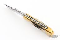 This lockback by Rob Davidson features a satin polished blade with nail nick and fileworked spine. The handle has brass bolsters, stag covers, brass liners and a fileworked stainless steel backspacer. Has a few light scratches, otherwise excellent condition. #152