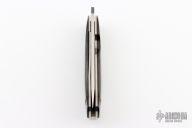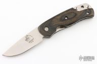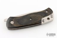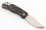 This Linerlock by Mike Franklin features a satin finished blade with notched thumbrest. The handle has dymondwood scales, polished and jeweled titanium liners, stainless steel backspacer with lanyard hole. Nice detent, and lock and blade seating. Has some light scratches, otherwise excellent condition.