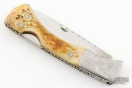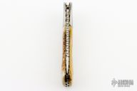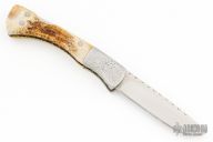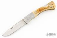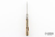 This lockback by Bob Wiygul features a satin finished blade with nail nick and fileworked spine. The handle has textured and dovetailed stainless steel bolsters, jigged bone scales, fileworked brass liners, fileworked stainless steel backspacer. Has some light scratches, otherwise excellent condition.