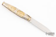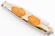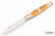 This vintage slipjoint by Zafrill Albacete features a hand rub satin finished blade with nail nick. The handle has a brass frame with orange pearlex inlays. Has a couple light scratches, otherwise excellent condition.