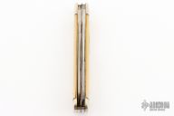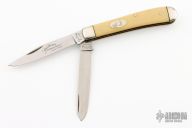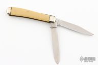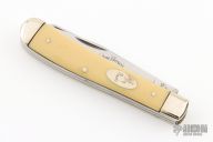 This slipjoint folder by "Jim Bowie" brand knives features tumbled and polished blades with a nail nicks. The handle has nickel silver bolsters, front and rear, ivory composite scales, brass liners and a stainless steel springs. Has a few light scratches, otherwise excellent condition.